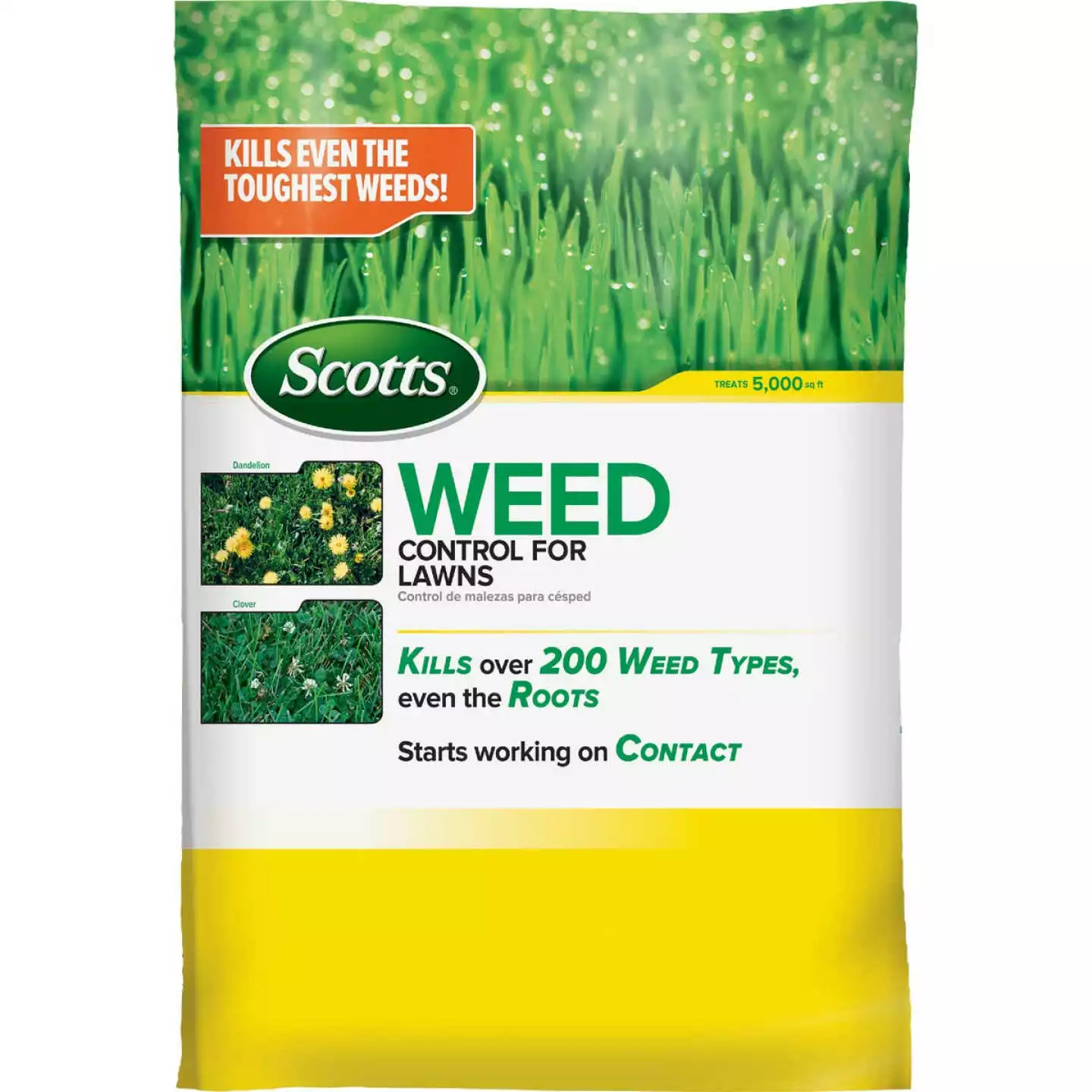 Scotts weed control for lawns kills over 200 weed types, including dandelions and clover. Works on contact, kills down to the root. Apply anytime weeds are actively growing. Guaranteed results. 0-1-1. Glyphosate-free.