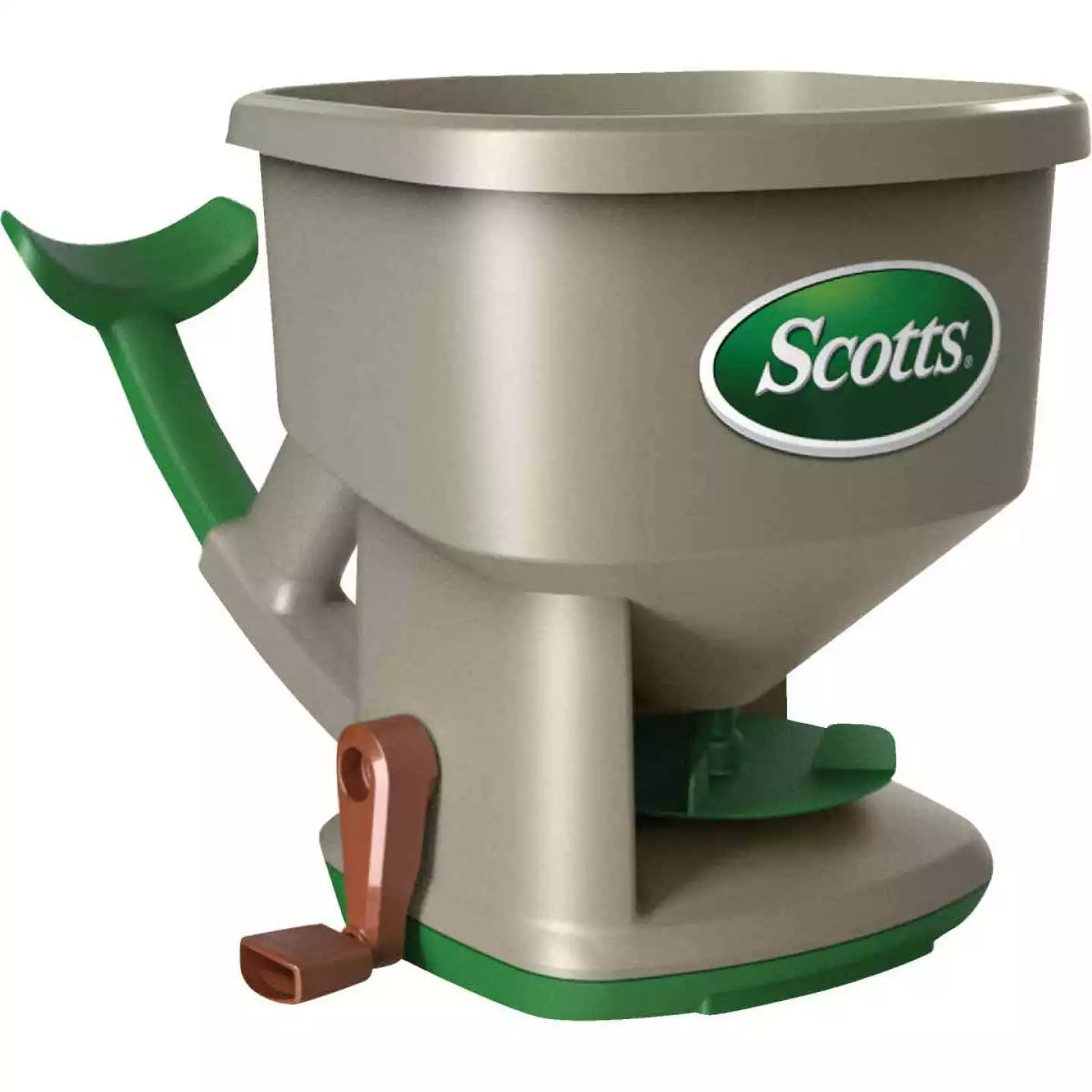 Handheld spreader’s arm support comes from the bottom. Rounded handle for increased comfort and larger grip makes cranking easier. Setting dial makes changing spreader setting easier. Updated design reduces product getting stuck in gear box. Holds up to 1000 Sq. Ft. of Scotts Lawn Care. Great for applying lawn seed and fertilizer, or ice-melting products in the winter.